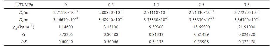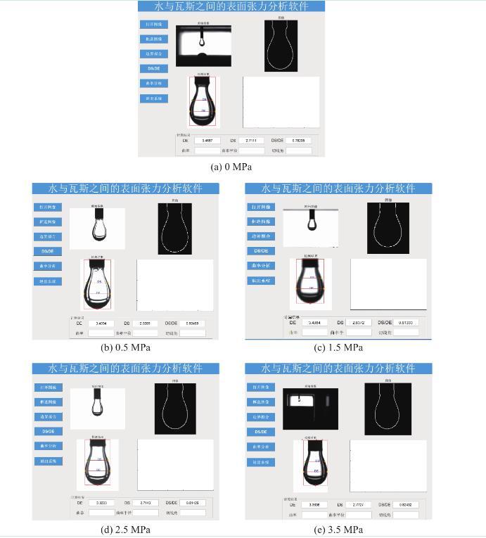 采用團隊自開發(fā)的水與瓦斯之間的表面張力分析軟件對不同瓦斯壓力條件下的水滴形貌(圖3)進行分析,即可獲得式(1)中的Ds及De。F為G修正后的形狀因子,F(xiàn)通過查表及插值法獲得,式(1)中的參數(shù)見表1,將表1中的參數(shù)帶入式(1)及式(2),即可獲得不同瓦斯壓力條件下水與瓦斯之間的表面張力(圖4)。
