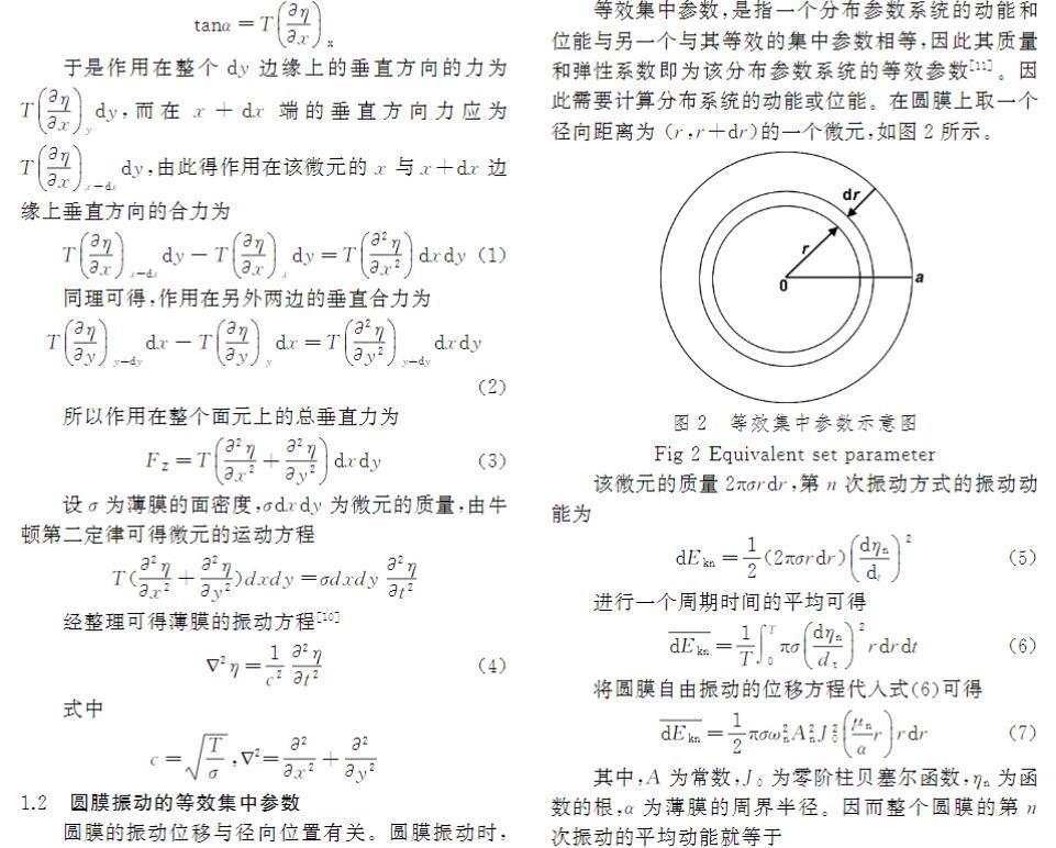 分析薄膜振動需進行受力分析。薄膜所受內(nèi)力僅為張力。設(shè)單位長度薄膜張力為T(N/m),單位面積質(zhì)量為ρ。取薄膜平衡位置在xy平面內(nèi)的微元體分析(圖1),當(dāng)其受到垂直xy面的外力擾動后,會在張力T作用下產(chǎn)生橫向振動,恢復(fù)力主要為張力。