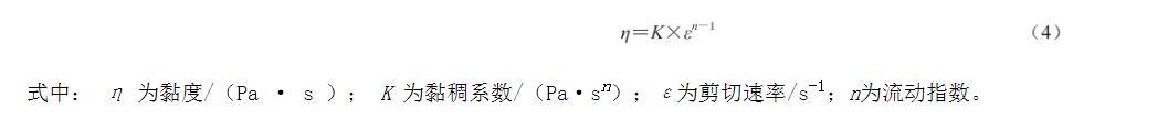 式中:η為黏度/(Pa·s);K為黏稠系數(shù)/(Pa·sn);ε為剪切速率/s-1;n為流動(dòng)指數(shù)。