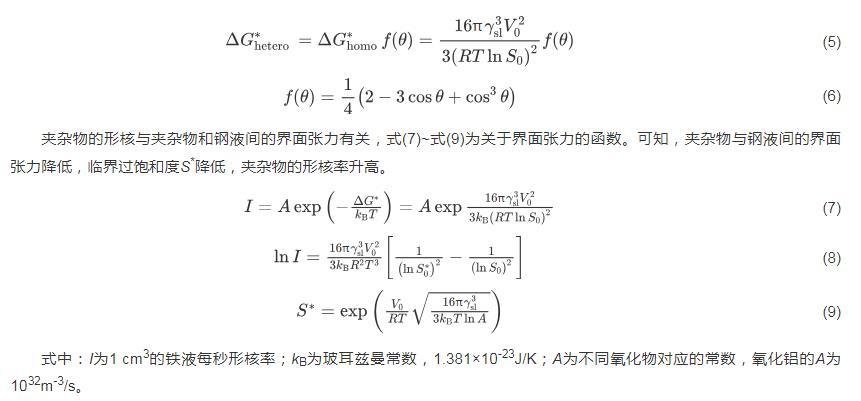 夾雜物的形核與夾雜物和鋼液間的界面張力有關(guān),式(7)~式(9)為關(guān)于界面張力的函數(shù)。可知,夾雜物與鋼液間的界面張力降低,臨界過飽和度S*降低,夾雜物的形核率升高。