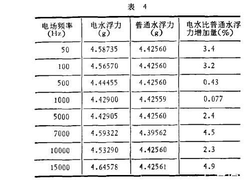 實(shí)驗(yàn)用的振蕩穩(wěn)壓源是上海華東電子儀器廠制造的,輸出功率75W,該電源的電壓在實(shí)驗(yàn)時(shí)保持300V、600V和700V三個數(shù)值。改變頻率從0到15kHz,水流過電場的速度為0.16m/s,水溫12.0±0.3℃,用長春市自來水和地下深井水。電水形成后20分鐘開始測浮力。測試時(shí)間為1984年10月18日到1984年10月21日,重復(fù)性實(shí)驗(yàn)進(jìn)行六次,曲線都帶有極值。表4是在電壓600V下的一組數(shù)據(jù)。