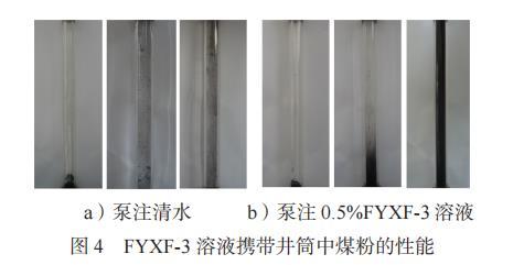 由圖4a)看出,裝有清水的有機(jī)玻璃管底部的煤粉沒有被懸浮,且泵注后,排出液中幾乎沒有攜帶出煤粉。由圖4b)看出,裝有0.5%FYXF-3溶液的有機(jī)玻璃管底部的煤粉被懸浮,且泵注后,排出液為黑色渾濁液體,攜帶出煤粉質(zhì)量為0.25g??梢钥闯觯瑵舛葹?.5%的FYXF-3溶液對(duì)煤粉的懸浮性能較好,可以將井筒堆積的韓城現(xiàn)場煤粉懸浮,并隨著返排液返排至地面。