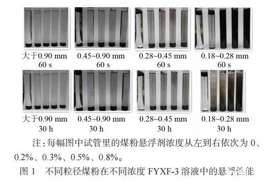 粒徑方面,粒徑大于0.90mm、0.45~0.90mm的煤粉懸浮效果較差,粒徑為0.28~0.45mm的煤粉效果顯著且沒有明顯分層現(xiàn)象;濃度方面,F(xiàn)YXF-3濃度越大,懸浮效果越好,濃度不小于0.3%后,懸浮效果顯著。
