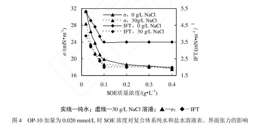 測試發(fā)現(xiàn)辛基酚聚氧乙烯醚-10(OP-10)在純水溶液中的ccmc為0.08 mmol/L(0.052 g/L),該濃度下溶液的表、界面張力分別為30.16 mN/m和5.68 mN/m;OP-10在30 g/L NaCl溶液中的ccmc為0.020 mmol/L(0.013 g/L),該濃度下溶液的表、界面張力分別為31.89 mN/m和8.61 mN/m。因此,選擇與SOE復(fù)合的OP-10的濃度為0.020 mmol/L。