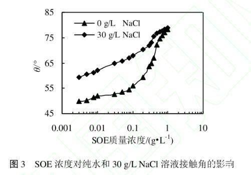 圖3 SOE濃度對純水和30 g/L NaCl溶液接觸角的影響