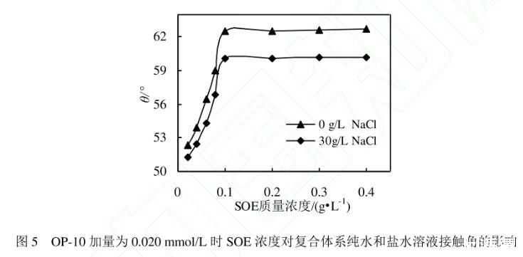圖5 OP-10加量為0.020 mmol/L時(shí)SOE濃度對復(fù)合體系純水和鹽水溶液接觸角的影響