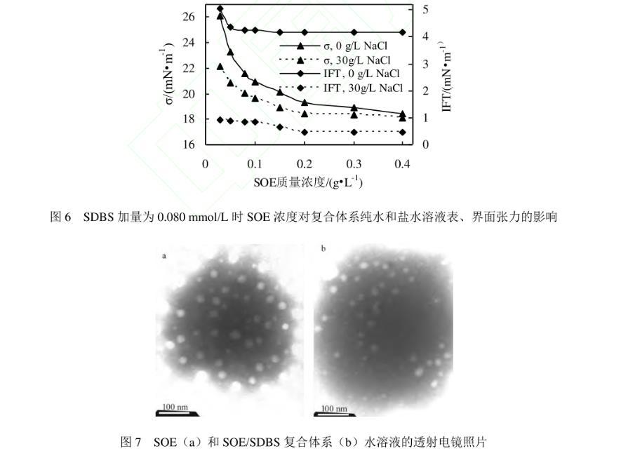 測試發(fā)現十二烷基苯磺酸鈉(SDBS)在純水溶液中的ccmc為0.5 mmol/L(0.174 g/L),該濃度下溶液的表、界面張力分別為27.06 mN/m和0.18 mN/m;SDBS在30 g/L NaCl溶液中的ccmc為0.080 mmol/L(0.028 g/L),該濃度下溶液的表、界面張力分別為27.62 mN/m和0.21 mN/m。因此,選擇與SOE復合的SDBS的濃度為0.08 mmol/L。