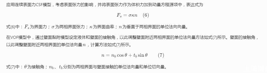 式(6)中:F_{s}為界面力;sigma為兩相界面張力;kappa為界面曲率;n為垂直于兩相界面的單位法向向量。