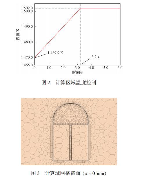 計(jì)算域網(wǎng)格截面(x=0mm)如圖3所示,整體上采用多面體網(wǎng)格,在釬料涂覆區(qū)域內(nèi)外均設(shè)置邊界層網(wǎng)格,為準(zhǔn)確捕捉多余釬料在母材表面的流失過(guò)程,對(duì)母材表面的網(wǎng)格進(jìn)行加密。
