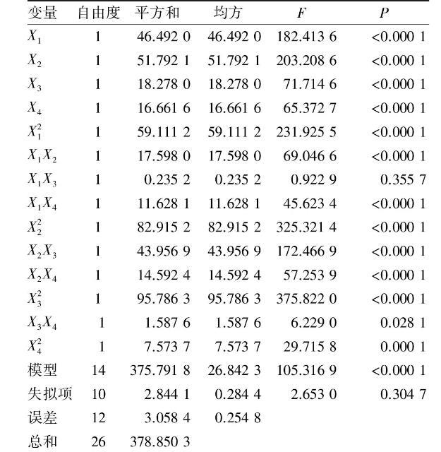 影響因素之間的交互作用除X1X3影響不顯著、X3X4影響顯著外,其余交互項(xiàng)影響極顯著。