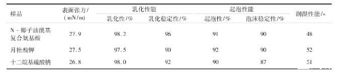 測(cè)定了以大豆粕為原料合成的N-椰子油?;鶑?fù)合氨基酸產(chǎn)物表面活性性能,同時(shí)與陰離子表面活性劑月桂酸鉀、十二烷基硫酸鈉表面活性進(jìn)行了比較,結(jié)果見表4。