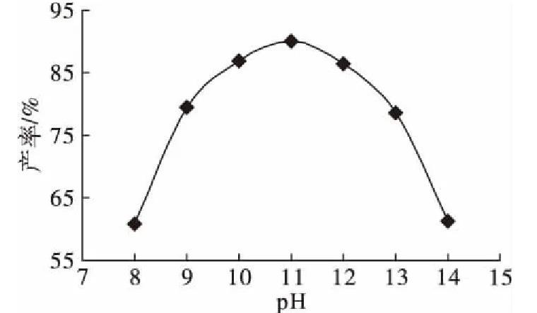由圖2可以看出,pH影響產(chǎn)率的總體趨勢(shì)是首先逐步提高,達(dá)到最大值后逐步下降,pH為11時(shí)產(chǎn)物產(chǎn)率最大。因此,選擇pH 10~12進(jìn)行優(yōu)化試驗(yàn)。