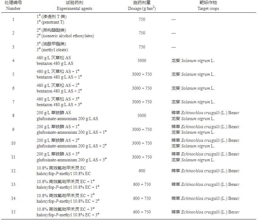 植物葉片性質(zhì)的不同會(huì)影響藥液的潤(rùn)濕和持留能力。接觸角測(cè)定結(jié)果(表3)顯示:無(wú)論靶標(biāo)作物是禾本科的稗草還是闊葉科的龍葵,2#增效劑的接觸角均最小,且3種除草劑中添加2#增效劑后接觸角減小的程度最大(6,10,14),添加3#增效劑后接觸角減小的程度最小,因此,2#增效劑減小接觸角的性能最好。