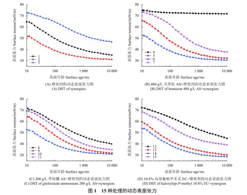 測(cè)定結(jié)果如圖1(A)所示:處理2降低表面張力的速度最快,且在10 000 ms時(shí)表面張力達(dá)到最小值,處理3降低表面張力的速度最慢,說(shuō)明2#增效劑的效果最好,3#增效劑最差。與未添加增效劑的處理(4,8,12)相比,添加增效劑后除草劑表面張力的降低速度更快,10 000 ms時(shí)所達(dá)到的靜態(tài)表面張力值也更小,其中也是2#增效劑的效果最好。