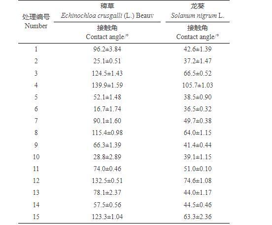 1.2.4接觸角測(cè)定選取新鮮且潔凈的均為6葉期的稗草和龍葵葉片,避開(kāi)葉脈和病斑,選取平整部分剪取小塊的葉肉,滴加5μL待測(cè)樣品,10 s后記錄接觸角大小,至少重復(fù)3次,計(jì)算平均接觸角。