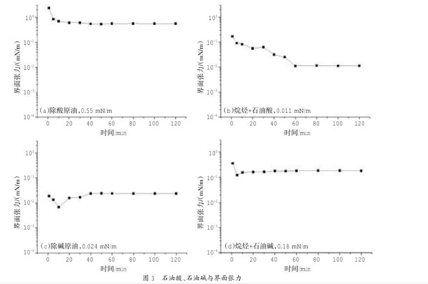 為研究遼河石油酸、石油堿與界面活性之間的關(guān)系,首先測量了遼河兩性表面活性劑與原油之間的界面張力,為0.005 2 mN/m,可以超低;也測量了表面活性劑與烷烴之間的界面張力,為1.38 mN/m,界面活性較差;在此基礎(chǔ)上考察石油酸、石油堿對(duì)降低界面張力的貢獻(xiàn)。由圖3可以看出,在原油剔除石油酸組分后,界面張力由超低陡然升高至0.55 mN/m,說明石油酸組分對(duì)超低界面張力的形成具有非常重要的作用,也說明在遼河油田的兩性表面活性劑二元復(fù)合驅(qū)中,石油酸組分依然發(fā)揮著原油活性物質(zhì)的作用;在烷烴組分添加石油酸后,界面張力由1.38 mN/m降低至0.011 mN/m,兩個(gè)數(shù)量級(jí)的降低,進(jìn)一步說明石油酸組分與遼河兩性表面活性劑之間具有明顯的相互作用,是有效降低界面張力的重要原油組分。
