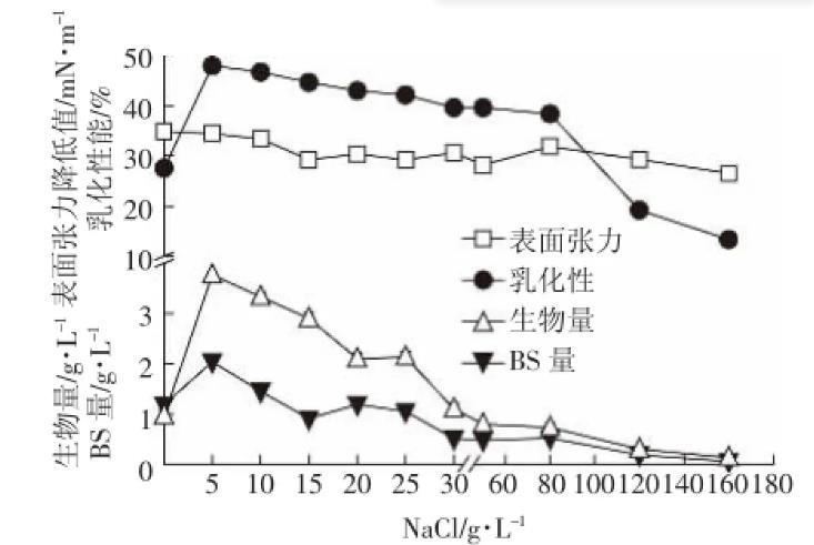 NaCl濃度通過改變細胞滲透壓影響微生物的生長與代謝,從而影響發(fā)酵產(chǎn)物的產(chǎn)量。由圖6可見,鹽濃度在0~5 g·L-1之間,細菌生長受到促進,而當(dāng)鹽濃度大于5 g·L-1時,細菌的生長受到抑制,糖脂量與生物量趨勢一致。菌株的生物量、生物表面活性劑量、表面張力值與乳化性均在鹽濃度為5 g·L-1時呈現(xiàn)最大,說明該菌株具有一定的耐鹽性,與強婧等研究的生物表面活性劑產(chǎn)生菌Pseudomonas aeruginosa S6也能夠耐鹽相似。此外,本菌株在最高為25 g·L-1的鹽濃度條件下依然能夠存活,但此時已不能產(chǎn)生更多的生物表面活性劑。