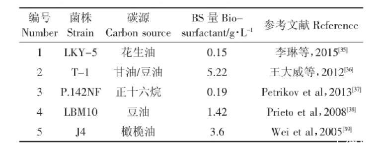 最佳培養(yǎng)條件下,本實驗細菌生物量最高能達到5.22 g·L-1(表6),生物表面活性劑量達到5.09 g·L-1。相對已報道的幾株銅綠假單胞菌(Pseudomonas aeruginosa)合成生物表面活性劑的產(chǎn)率在2.12~15.92 g·L-1范圍內(nèi),本菌株的產(chǎn)表面活性劑能力居中。