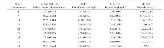 表5碳氮比對147細菌生長以及生物表面活性劑產(chǎn)量的影響