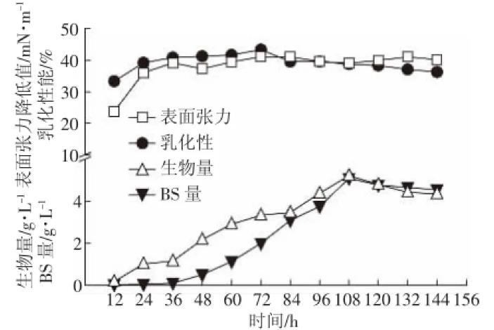 在上述花生油25 mL·L-1為碳源、硫酸銨1 g·L-1為氮源、NaCl濃度為5 g·L-1、pH=8、溫度保持為30℃的最佳培養(yǎng)條件下,追蹤細菌147的發(fā)酵動態(tài)(圖7)。菌株經(jīng)過短暫的延滯期后進入對數(shù)生長期,108 h后進入穩(wěn)定增長期,此時菌體所產(chǎn)生的生物表面活性劑含量達到最大,此后生物表面活性劑含量減少,可能是因為后期培養(yǎng)基內(nèi)的碳源已經(jīng)用盡,細菌開始以胞外分泌物糖脂為碳源維持生命。而表面張力值與乳化性在24 h后達到最大,之后維持在穩(wěn)定水平,說明細菌在24 h后產(chǎn)生的生物表面活性劑已到達生物表面活性劑的臨界膠束濃度,此后生物表面活性劑產(chǎn)量還會增加,但是表面張力降低值與乳化性只維持在一定范圍內(nèi)波動。