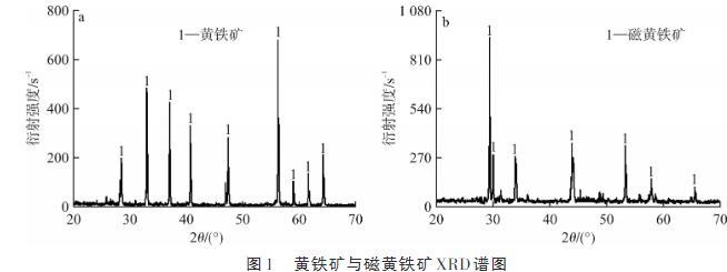 由圖1可知:試驗所用黃鐵礦與磁黃鐵礦純度較高,均達(dá)到90%以上,雜峰很少,符合試驗要求,可以用作后續(xù)試驗研究。
