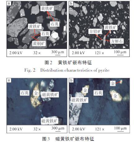 由圖3可知:磁黃鐵礦在礦石中主要以嵌布形式存在,主要嵌布于脈石礦物粒間,少量嵌布在脈石礦物裂隙中。嵌布于脈石礦物粒間的磁黃鐵礦粒度以大于0.037 mm為主,而嵌布在脈石礦物裂隙中的磁黃鐵礦多呈細(xì)脈狀構(gòu)造產(chǎn)出。常見金礦物與磁黃鐵礦連晶嵌布于脈石礦物粒間,這表明磁黃鐵礦與金礦物之間存在密切的關(guān)系,磁黃鐵礦同樣是主要載金礦物。