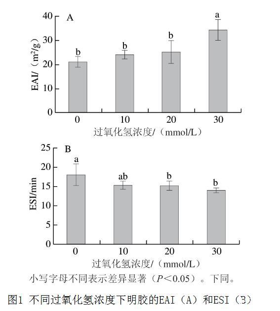 圖1 不同過氧化氫濃度下明膠的EAI(A)和ESI(B)