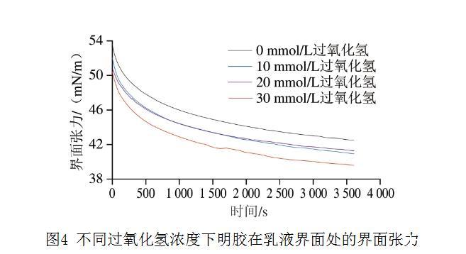兩親性蛋白質(zhì)促進蛋白質(zhì)吸附到油-水界面并降低油相和水相之間的界面張力,從而形成穩(wěn)定的界面層。如圖4所示,氧化組的明膠界面張力均低于對照組,這表明所有明膠樣品均具有表面活性。明膠在油-水界面處的界面張力隨著過氧化氫濃度的增加而降低。不同過氧化氫濃度下明膠的界面張力隨時間的延長逐漸降低,從未氧化組的53.8 mN/m下降到30 mmol/L組的50.7 mN/m。界面張力隨著吸附時間的延長而降低,下降速率逐漸減小,這反映了蛋白質(zhì)在界面上的吸附和覆蓋。明膠界面張力的下降與其更好的兩親性有關(guān)。因此,在本研究中氧化導(dǎo)致明膠水接觸角的增加,提高了明膠的疏水性并改善了明膠的兩親性,增加了蛋白質(zhì)向油-水界面的吸附,這可能引起油-水界面張力的下降。Feng Xin等支持這一觀點并報道,在豬皮明膠的提取過程中提高提取溫度也會引起界面張力的降低,并認為隨著提取溫度的升高會破壞明膠原有的三螺旋結(jié)構(gòu),從而暴露出更多的疏水基團,這促使明膠分子能夠更快地吸附到油-水界面上,從而更大程度地降低界面張力。