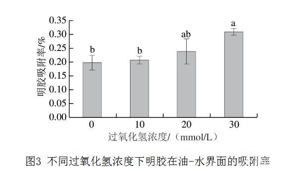如圖3所示,乳液中油-水界面的明膠吸附率隨著過氧化氫濃度的增加而增加,從對照組的19.8%增加到30 mmol/L過氧化氫組的30.9%,增加1 倍左右,這表明更多氧化明膠分子吸附到油-水界面。Chen Jiahui等對肌原纖維蛋白進行超聲處理,發(fā)現(xiàn)超聲處理改變了肌原纖維蛋白的結(jié)構(gòu),從而有利于形成尺寸更小、更靈活的聚集體,促進蛋白質(zhì)在油-水界面的吸附,減少油-水界面的界面張力。在米糠蛋白的氧化中也觀察到類似的現(xiàn)象。氧化導(dǎo)致米糠蛋白中暴露出更多的疏水基團,促進了蛋白質(zhì)在油-水界面的吸附,形成黏彈性膜,降低界面張力,使液滴分裂成更小的尺寸。相似地,Zou Heinan等利用高強度超聲處理減小了貽貝肌漿蛋白的尺寸并增強了其表面疏水性,從而增加了蛋白質(zhì)在油-水界面的吸附。