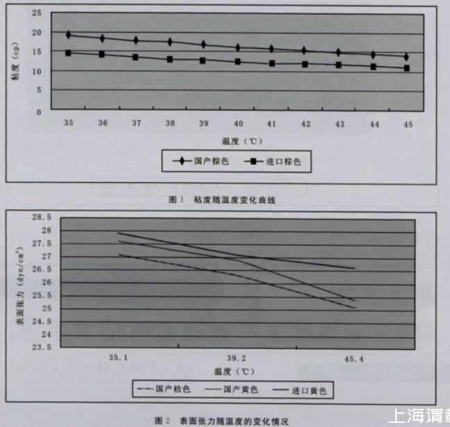 3)進(jìn)口陶瓷墨水與國(guó)產(chǎn)陶瓷墨水相比,內(nèi)在的性能參數(shù)(表面張力、粘度、容重)隨溫度變化的規(guī)律一致。