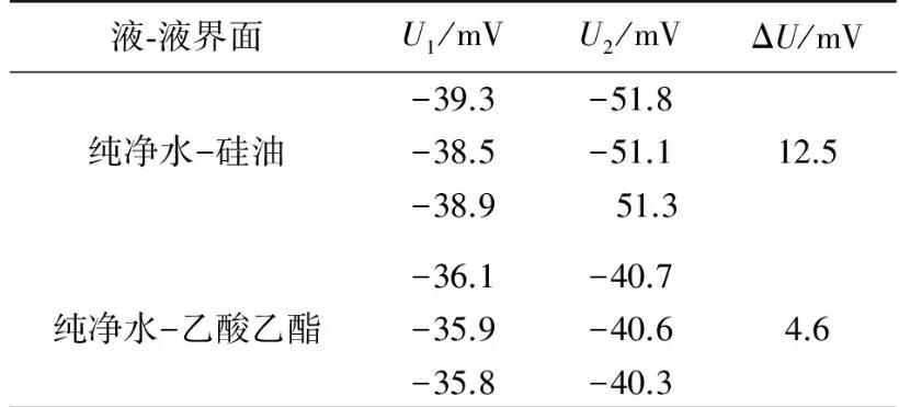 實驗測量所用金屬吊環(huán)的外徑、內徑分別為0.034 96 m和0.033 10 m.在20℃實驗條件下,采用自制2種液體間界面張力的動態(tài)實時測量儀,測量了純凈水-硅油和純凈水-乙酸乙酯間的界面張力.測量出金屬吊環(huán)由液體I中完全進入液體Ⅱ的過程中,液體I的液膜被拉斷前電壓的最大值U1,拉斷后趨于穩(wěn)定時的電壓值為U2,數(shù)據(jù)結果如表1所示.