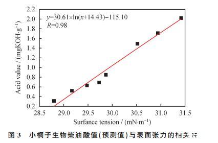 (2)通過氧化實驗得到的小桐子生物柴油的酸值與表面張力相關系數(shù)為0.99,表明可用表面張力預測酸值;比較4種預測模型的精度分析結果,確定對數(shù)模型(y=30.61x ln(x+14.43)-115.10)精度最高,其預測均方根誤差REMSP值及相關系數(shù)R分別為0.0937和0.9879,酸值預測值與真實值誤差為2.95%。