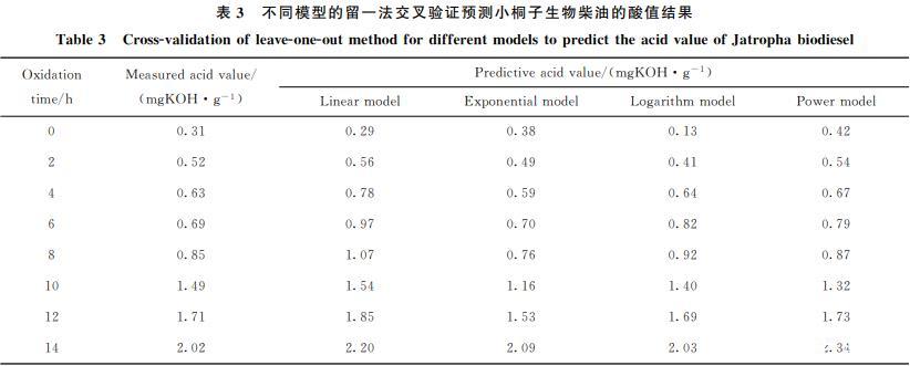 留一法交叉驗證是建立預測模型的一種常用方法,從N個觀測數(shù)據(jù)中選擇一個觀測數(shù)據(jù)作為驗證數(shù)據(jù),然后使用剩下的(N-1)個觀測數(shù)據(jù)擬合一個模型,并用驗證數(shù)據(jù)來驗證模型的精度,如此重復N次??紤]到數(shù)據(jù)量以及相關性,筆者利用Excel建立了線性、指數(shù)、對數(shù)、乘冪4種預測模型,對小桐子生物柴油酸值的預測結果見表3。