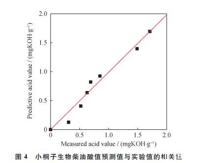 圖4為小桐子生物柴油的酸值實驗值與對數(shù)模型預測值的函數(shù)關系: