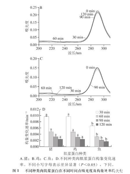 圖1不同種類肉肌漿蛋白在不同時(shí)間點(diǎn)吸光度及構(gòu)象速率的變化