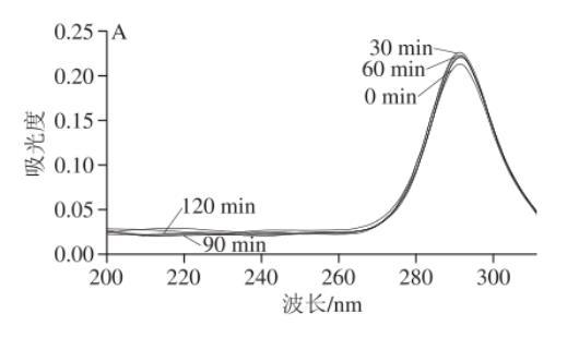 鹽酸胍誘導(dǎo)肌漿蛋白變性的熒光光譜如圖1A~C所示,3種肌漿蛋白都在290 nm波長(zhǎng)處達(dá)到最大吸光度,由于酪氨酸主要對(duì)250~290 nm波長(zhǎng)范圍內(nèi)具有吸收。由肌漿蛋白氨基酸組成可知,雞肉肌漿蛋白的酪氨酸含量最高,這也解釋了在第0分鐘時(shí)雞肉肌漿蛋白的吸光度相比較而言達(dá)到最大。而且豬肉和魚肉肌漿蛋白在第120分鐘時(shí)達(dá)到最大吸光度,這說明肌漿蛋白三級(jí)結(jié)構(gòu)改變時(shí),構(gòu)象發(fā)生重排且構(gòu)象展開,而雞肉肌漿蛋白在第120分鐘時(shí)吸光度有所下降,說明雞肉肌漿蛋白結(jié)構(gòu)改變較快。由圖1D可知,隨著時(shí)間的延長(zhǎng),構(gòu)象變化速率越來(lái)越小,并且在相同時(shí)間下,豬肉肌漿蛋白與雞肉肌漿蛋白的峰值變化速率無(wú)顯著差異(P>0.05),而魚肉肌漿蛋白峰值變化速率相比較而言顯著較慢(P<0.05)。這一結(jié)果表明,和魚肉肌漿蛋白相比,豬肉和雞肉的肌漿蛋白構(gòu)象柔順性更好。