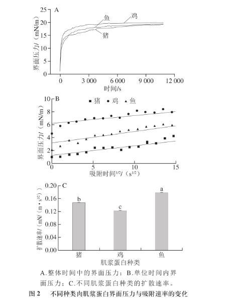 由圖2可知,不同種類肌漿蛋白的動(dòng)力學(xué)擴(kuò)散速率間存在差異性。蛋白質(zhì)分子在界面上的擴(kuò)散速率受其粒徑大小的影響,而本實(shí)驗(yàn)結(jié)果更能解釋這一現(xiàn)象。在前述理化指標(biāo)中,粒徑大小為雞肉肌漿蛋白>豬肉肌漿蛋白>魚肉肌漿蛋白,而在本部分?jǐn)U散速率大小為雞肉肌漿蛋白<豬肉肌漿蛋白<魚肉肌漿蛋白。這可能是由于大粒徑的肌漿蛋白產(chǎn)生的空間位阻在一定程度上削弱了表面疏水性提高帶來(lái)的吸附速率增加。而且魚肉肌漿蛋白的擴(kuò)散速率較豬肉和雞肉肌漿蛋白間顯著較大(P<0.05),但雞肉與豬肉肌漿蛋白之間的擴(kuò)散速率卻無(wú)顯著性差異(P>0.05)。