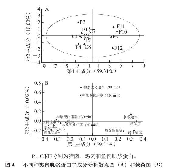 由于測(cè)量指標(biāo)間存在線性相關(guān)性,單一的指標(biāo)不能更清楚地反映出不同種類肉肌漿蛋白間的差異性,因此進(jìn)一步進(jìn)行主成分分析。由圖4A可知,第1主成分占59.31%,第2主成分占10.02%,總共占比69.33%,其中樣本F10、F11以及F12對(duì)第1主成分貢獻(xiàn)率較大,且與第1主成分呈正相關(guān),而C7樣本對(duì)第2主成分貢獻(xiàn)率較大且呈正相關(guān)。由圖4B可知,肌漿蛋白的擴(kuò)散速率、溶解度、乳化活性、乳化穩(wěn)定性、表面疏水性、電位、構(gòu)象在30 min及60 min時(shí)的變化速率對(duì)第1主成分貢獻(xiàn)率較大,其中擴(kuò)散速率和溶解度與第1主成分呈正相關(guān),而除此以外的其他指標(biāo)與第1主成分呈負(fù)相關(guān)。而蛋白的構(gòu)象在90 min以及120 min時(shí)的變化速率對(duì)第2主成分的貢獻(xiàn)率較大。圖中的乳化活性、表面疏水性、乳化穩(wěn)定性及電位間距離較近,說明這些指標(biāo)間存在一定的相關(guān)性。綜合前述的研究結(jié)論可知肌漿蛋白的乳化活性和乳化穩(wěn)定性與其表面疏水性、電位和構(gòu)象變化速率有較強(qiáng)的相關(guān)性,而擴(kuò)散速率與溶解度間相關(guān)性較強(qiáng)。