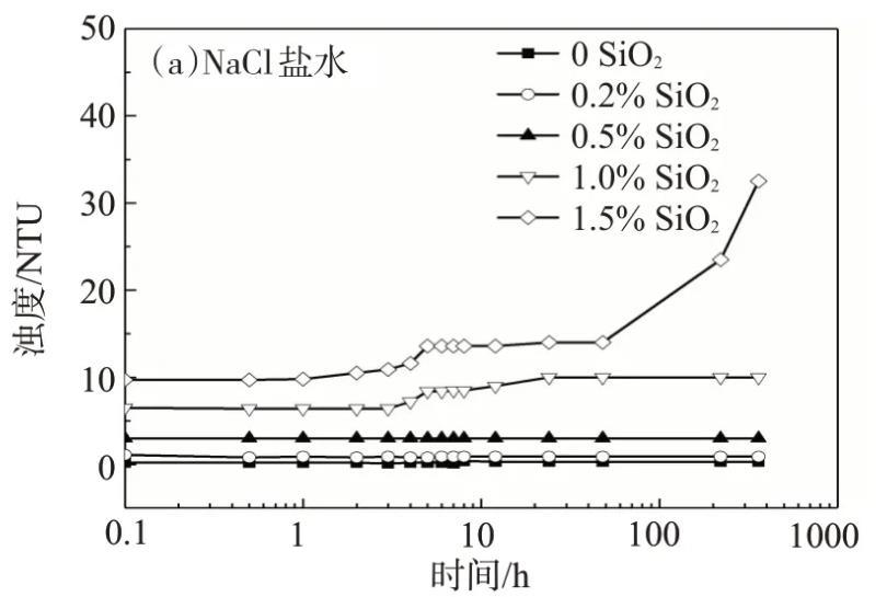 用模擬地層水配制的納米SiO2/SDS體系經(jīng)歷了澄清透明-渾濁-沉降的3個(gè)階段,靜置初始,納米SiO2質(zhì)量分?jǐn)?shù)為0.5%的體系的濁度不隨時(shí)間的延長(zhǎng)而變化,表明此時(shí)體系穩(wěn)定;靜置1 h后,濁度明顯增加;靜置6 h后,體系的濁度又恢復(fù)到了初始值,由于實(shí)驗(yàn)測(cè)試的是樣品上半部分的濁度,說(shuō)明此時(shí)體系已經(jīng)完全沉降。