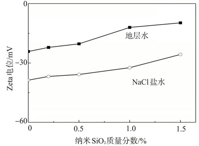 從圖2還可以看出,隨著納米SiO2含量的增加,用兩種鹽水配制體系的|ζ|均不斷降低,且納米SiO2的含量越大,顆粒之間的距離越小,由于布朗運(yùn)動(dòng)相互碰撞聚結(jié)在一起的機(jī)率就越大,因此體系的穩(wěn)定性越差。