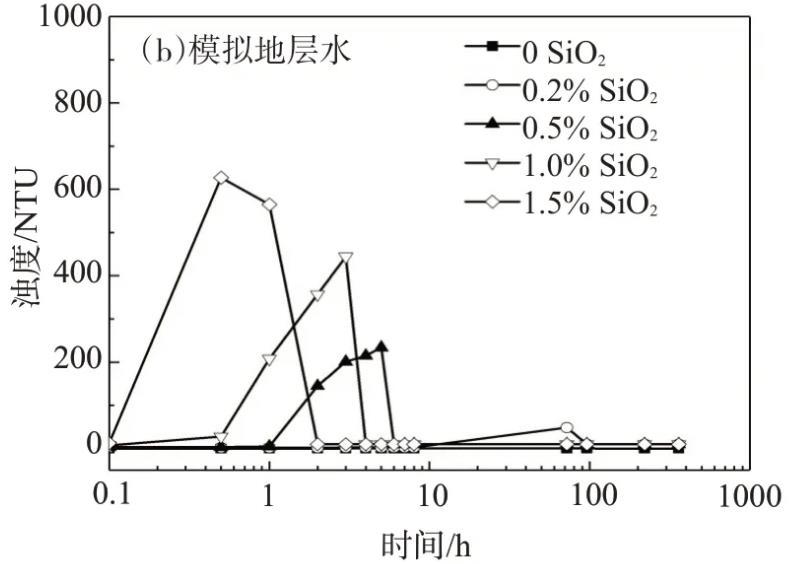 利用沉降法和濁度法分析分別用NaCl鹽水、模擬地層水配制的不同納米SiO2含量的納米SiO2/SDS體系的穩(wěn)定性,濁度法測(cè)試結(jié)果如圖1所示。用NaCl鹽水配制的SiO2/SDS體系在靜置15 d時(shí),僅納米SiO2質(zhì)量分?jǐn)?shù)為1.5%的體系出現(xiàn)了輕微的渾濁,而其它體系均保持澄清透明;當(dāng)納米SiO2質(zhì)量分?jǐn)?shù)為1.5%時(shí),SiO2/SDS體系的濁度隨靜置時(shí)間的延長(zhǎng)稍有增大,其它體系的濁度幾乎不隨靜置時(shí)間的延長(zhǎng)而變化,且均小于15 NTU。由此可見,用NaCl鹽水配制的納米SiO2/SDS體系的穩(wěn)定性良好。