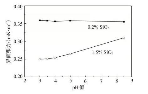 當SiO2質(zhì)量分數(shù)為1.5%時,納米SiO2/SDS體系靜置不久納米SiO2即聚集在一起,使得SiO2與SDS之間的排斥作用減小,隨著pH值的降低,水化作用力及H+保護層的形成使得納米SiO2聚集的幾率大大降低,SiO2顆粒在體系中分散較均勻,因此SiO2與SDS之間的排斥作用增大,體系降低油水界面張力的能力增強。當SiO2質(zhì)量分數(shù)為0.2%時,納米SiO2/SDS體系具有較好的穩(wěn)定性,pH值的下降對體系降低油水界面張力的能力基本無影響。