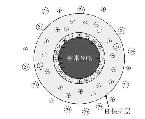 SiO2表面的羥基會和H+發(fā)生反應,所以和Ca2+、Mg2+、Na+離子相比,H+更容易吸附在納米顆粒表面。當體系中含有足夠量的H+時,H+離子可以在納米SiO2周圍形成保護層,如圖4所示。模擬地層水中極少量的二價Ca2+、Mg2+也會使納米SiO2失去穩(wěn)定性,H+保護層的存在降低了納米SiO2雙電層中二價離子的含量,從而減少了二價陽離子對納米SiO2穩(wěn)定性的破壞。