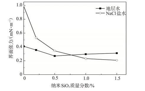 在NaCl鹽水中,納米SiO2/SDS體系的|ζ|基本大于30 mV,體系更易穩(wěn)定;模擬地層水中二價陽離子的存在使得體系的|ζ|均小于30 mV,顆粒容易聚集沉淀。納米SiO2含量越大,顆粒之間碰撞的機率增加,納米SiO2/SDS體系的穩(wěn)定性越差。隨著納米SiO2含量的增加,SDS降低油水界面張力的能力在NaCl鹽水中逐漸增強,而在模擬地層水中先增后減,在SiO2質(zhì)量分數(shù)為0.5%時界面張力達到最低。