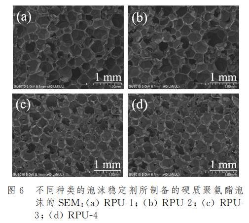 泡沫穩(wěn)定劑的存在對(duì)于硬質(zhì)聚氨酯泡沫性能影響在宏觀上有著十分顯著的體現(xiàn)。圖5是添加不同種類的泡沫穩(wěn)定劑后制樣得到的硬質(zhì)聚氨酯泡沫橫截面的數(shù)碼照片。結(jié)果表明,接枝APEG鏈段的PAVE-5和PGVF-6泡沫穩(wěn)定劑所制備的聚氨酯泡沫RPU-3和RPU-4,其泡孔結(jié)構(gòu)相較于市售產(chǎn)品所制備的聚氨酯泡沫展現(xiàn)出了更加細(xì)膩均勻的泡孔結(jié)構(gòu),而市售產(chǎn)品所形成的泡沫則表現(xiàn)出較為粗糙且孔徑不均勻的泡孔結(jié)構(gòu)。這表明親水結(jié)構(gòu)有利于泡沫穩(wěn)定劑均勻分散在多元醇中并使得反應(yīng)充分進(jìn)行,泡孔尺寸細(xì)小致密,有利于改善硬質(zhì)聚氨酯泡沫的壓縮性能。