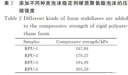 表2添加不同種類泡沫穩(wěn)定劑硬質(zhì)聚氨酯泡沫的壓縮強(qiáng)度