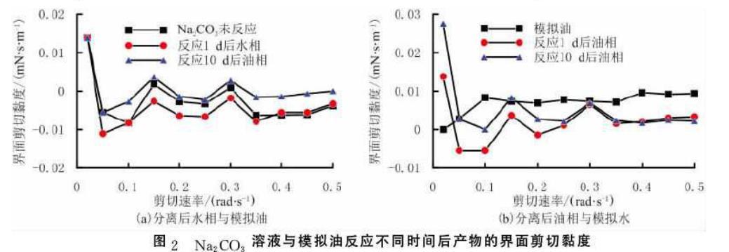 在Na2CO3溶液與模擬油反應(yīng)1d和10d后,分離得到的水相與模擬油及油相與模擬水的界面剪切黏度隨剪切速率變化關(guān)系見圖2.由圖2可以看出,Na2CO3溶液與模擬油反應(yīng)1d及10d后,分離得到的水相與模擬油的界面剪切黏度,與未反應(yīng)Na2CO3溶液與模擬油的界面剪切黏度相比變化不大;模擬油與Na2CO3溶液反應(yīng)1d及10d后,分離得到的油相與模擬水的界面剪切黏度與模擬油與模擬水間的界面剪切黏度相比變化不大,表明Na2CO3溶液與模擬油反應(yīng)后分離出的水相和油相對油水界面剪切黏度影響不大。原因是模擬油中的有機(jī)酸組分與Na2CO3溶液反應(yīng)所生成的,無論是水溶性還是油溶性的界面活性物質(zhì)均較少,在油水界面處的吸附不足以引起油水界面剪切黏度的變化。