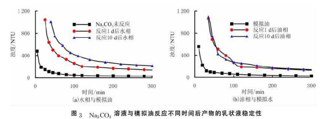 (3)與Na2CO3溶液與模擬油乳化所形成的乳狀液相比,Na2CO3溶液與模擬油反應(yīng)后的水相與模擬油形成的乳狀液的穩(wěn)定性增強(qiáng)。與模擬油與模擬水乳化所形成的乳狀液相比,Na2CO3溶液與模擬油反應(yīng)后的油相與模擬水形成的乳狀液的穩(wěn)定性增強(qiáng)。