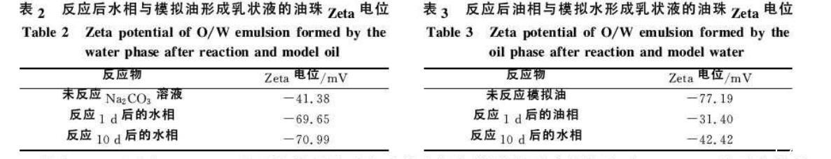 由表2可以看出,Na2CO3溶液與模擬油反應(yīng)后的水相與模擬油形成乳狀液,與Na2CO3溶液和模擬油直接乳化形成的乳狀液相比,油珠Zeta電位絕對值明顯增大;反應(yīng)10d的與1d的相比,變化很小。這是由于Na2CO3溶液與模擬油反應(yīng)后生成一些界面活性物質(zhì)溶于水相中,電離后帶負(fù)電荷,與模擬油乳化時,帶負(fù)電荷的界面活性物質(zhì)吸附在油珠表面上,使油珠表面帶更多負(fù)電荷,從而使油珠Zeta電位絕對值增大。隨著反應(yīng)時間的延長,生成的界面活性物質(zhì)逐漸增多,油珠Zeta電位絕對值也繼續(xù)增大,但增大的幅度很小。