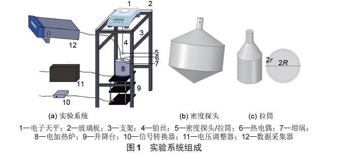 實(shí)驗(yàn)系統(tǒng)由測(cè)量系統(tǒng)、加熱系統(tǒng)、控制系統(tǒng)和支撐系統(tǒng)組成。實(shí)驗(yàn)系統(tǒng)如圖1(a)所示。測(cè)量系統(tǒng)由高精度電子天平(型號(hào)為METTLER TOLEDO ME104,精度為0.1 mg)、數(shù)據(jù)采集器(型號(hào)為key sight 34872 A)、熱電偶(K型)、探頭組成;加熱系統(tǒng)由電加熱爐和坩坩堝堝組成;控制系統(tǒng)由電壓調(diào)整器(型號(hào)為T6-1-4-060 DC)、智俊軟件組成;支撐系統(tǒng)由升降臺(tái)、鋼架、玻璃板組成。